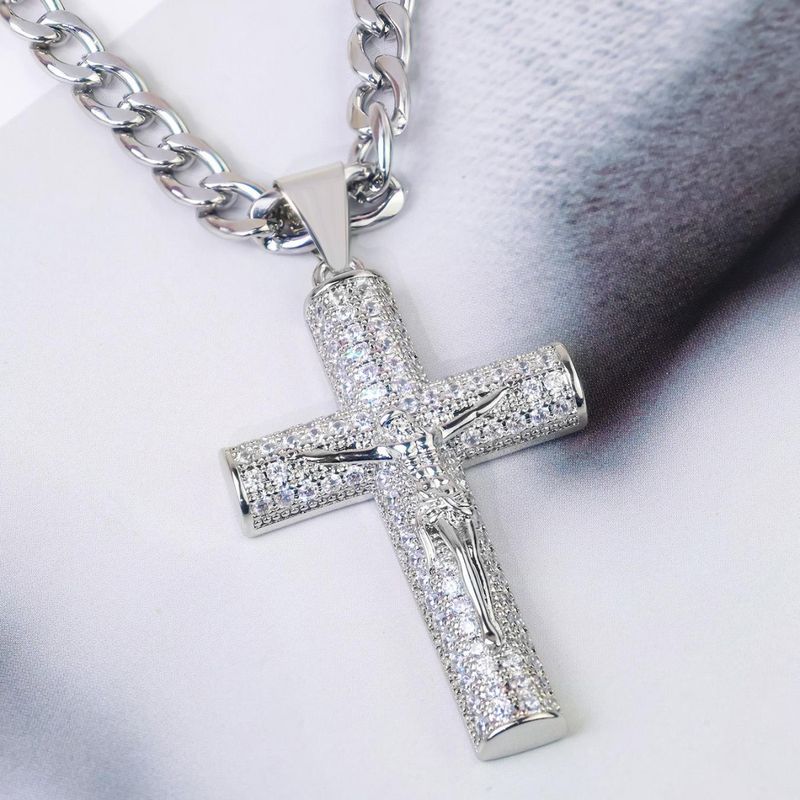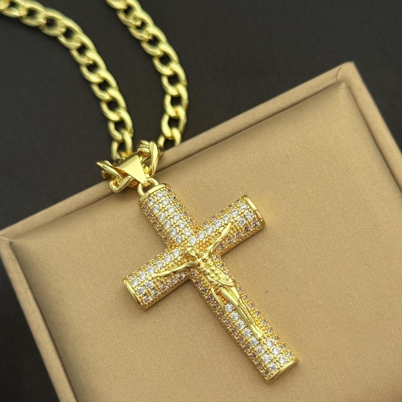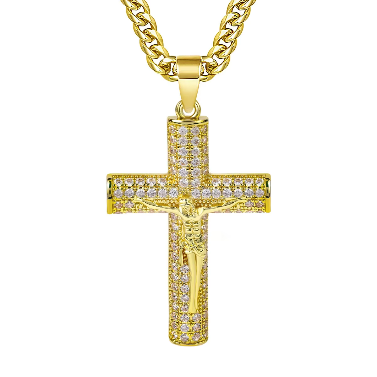 Large Diamond-Studded Cross Necklace with Gold-Plated Zirconia Cuban Chain